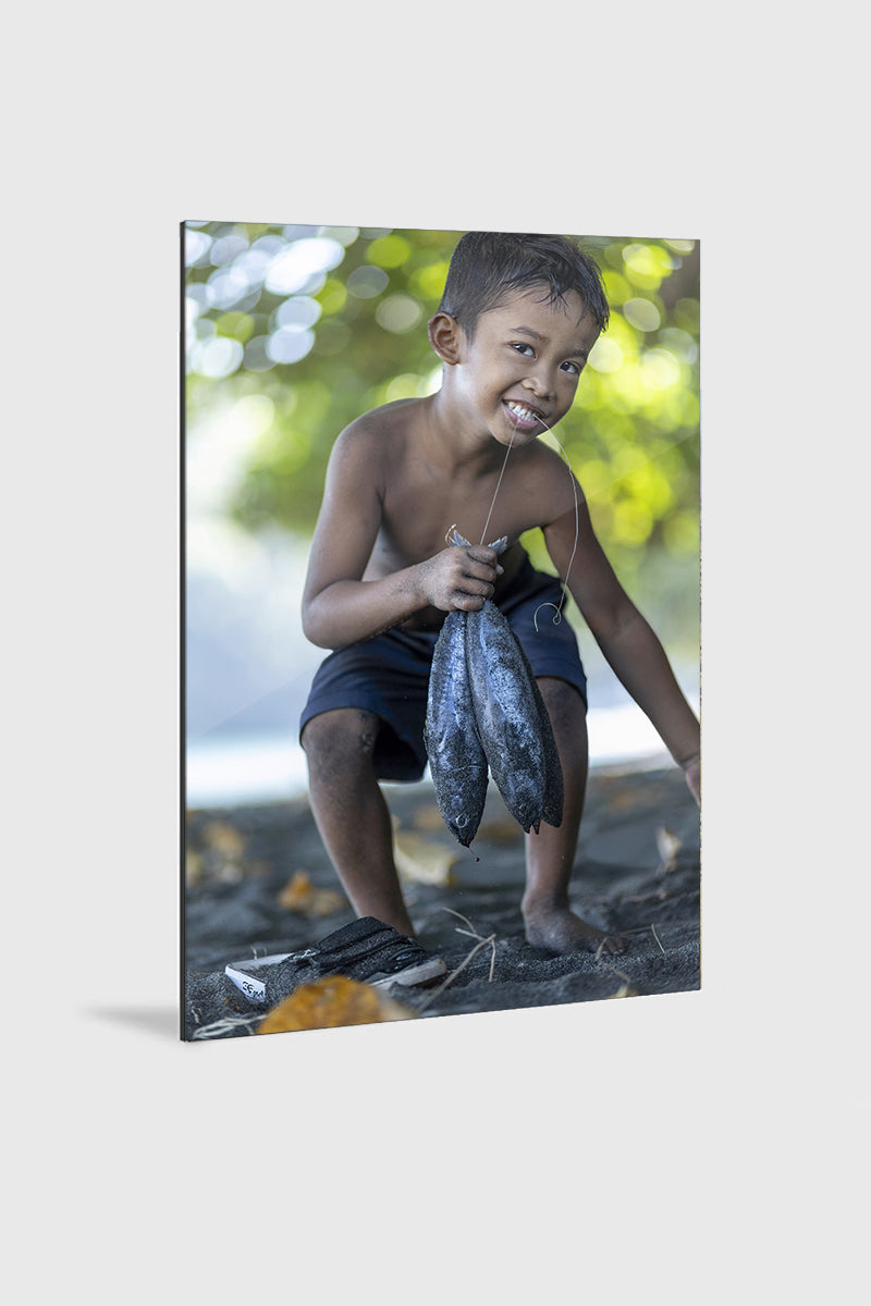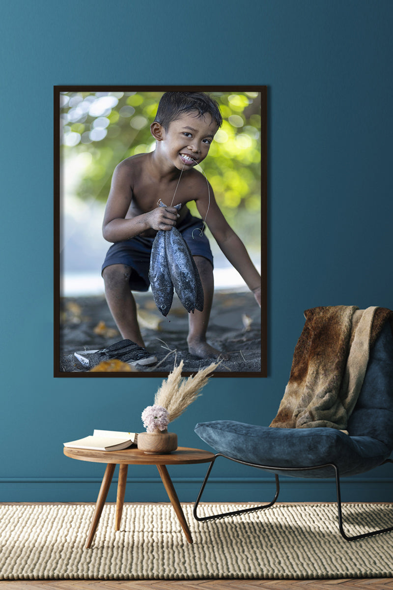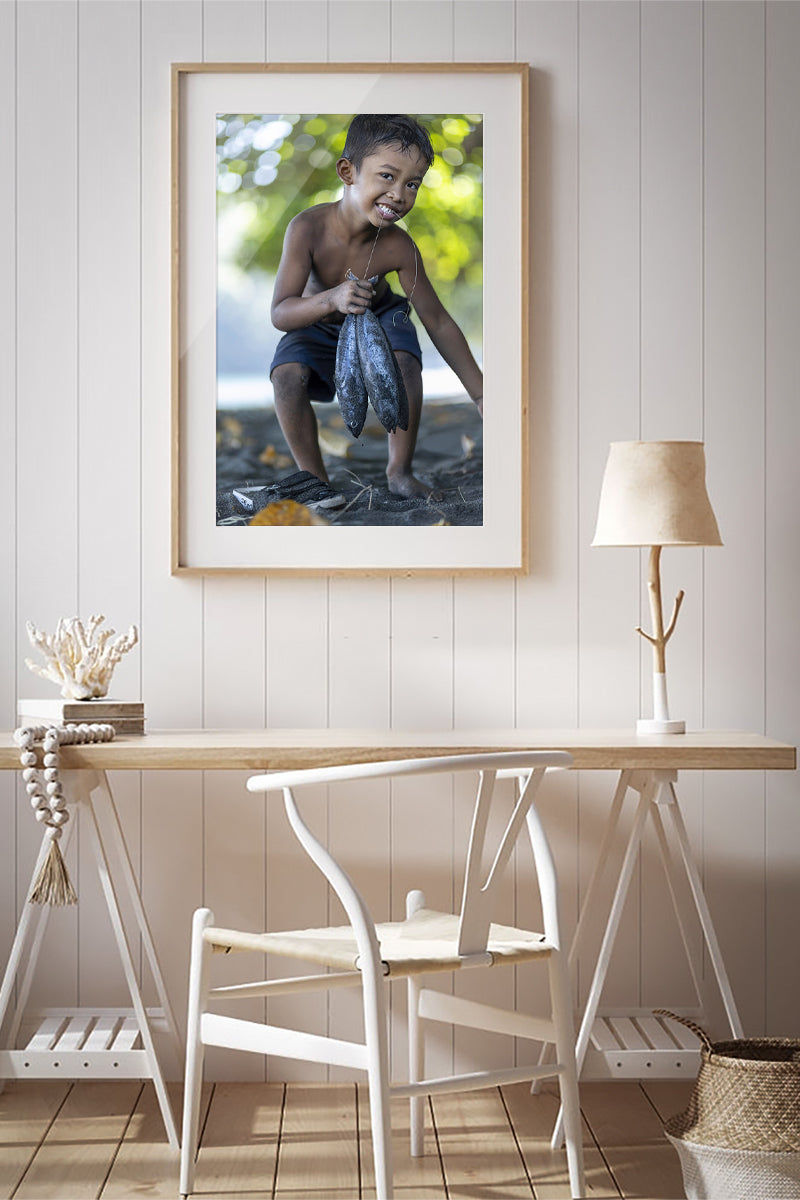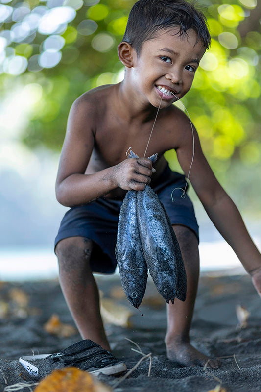 Keeper of the Sea—a portrait of Azka, a spirited young boy whose face beams with pride as he carries a bundle of ikan tongkol, a type of mackerel tuna abundant in Indonesian waters. Having just helped his father with the day's catch, his bright smile reflects both joy and responsibility. In coastal communities like his, fishing is more than a livelihood—it is a way of life, passed down through generations, binding families and neighbors together.