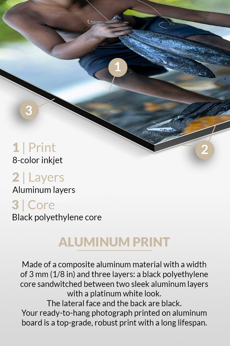 Printed on a sleek 3-mm, triple-layered aluminum composite material for a matte, reflection-free result using state-of-the-art printing method. Water-resistant, durable UV read-to-hang print suitable for sheltered, outdoor areas.